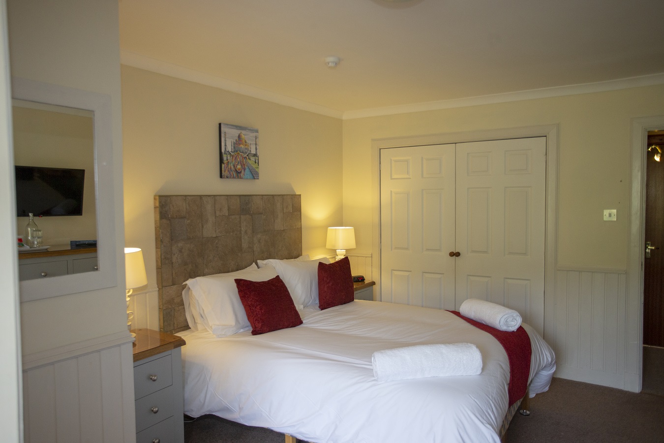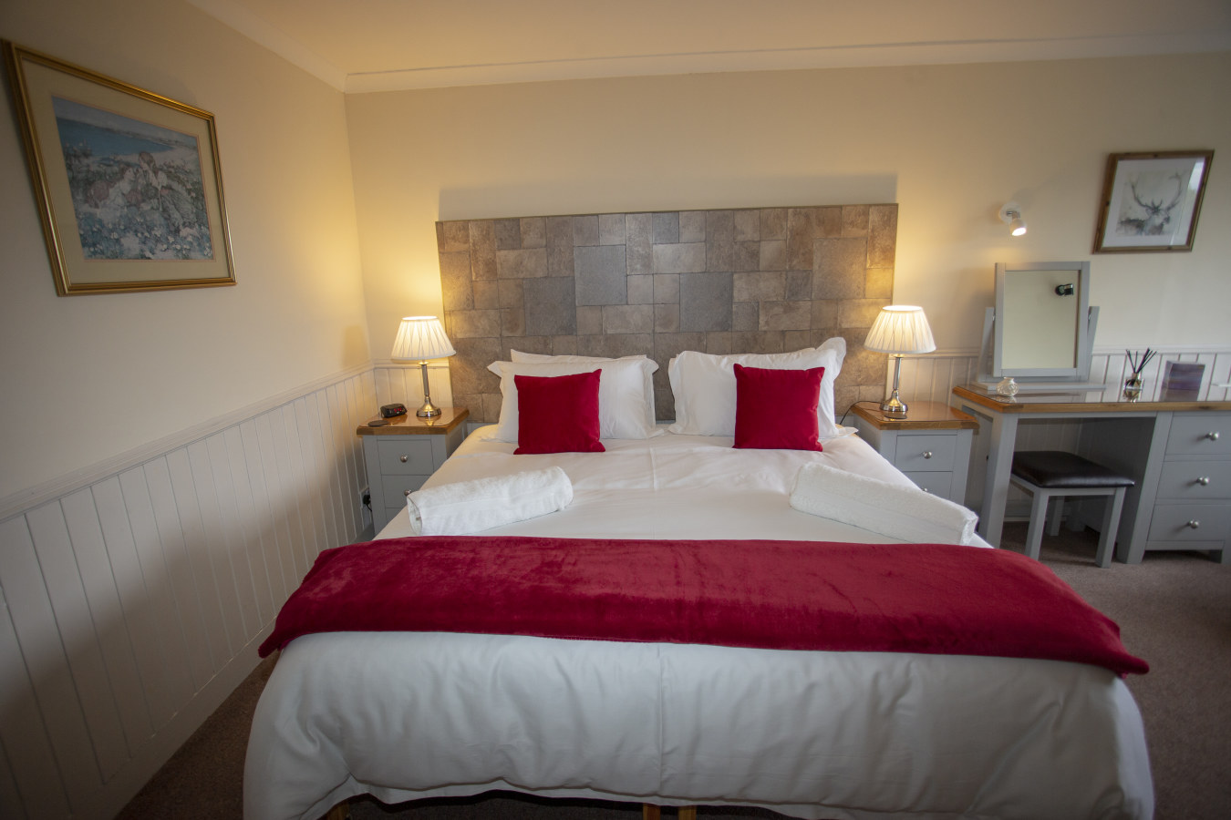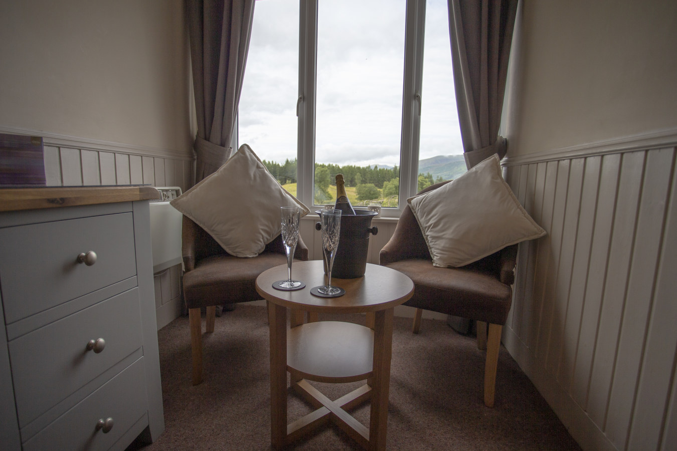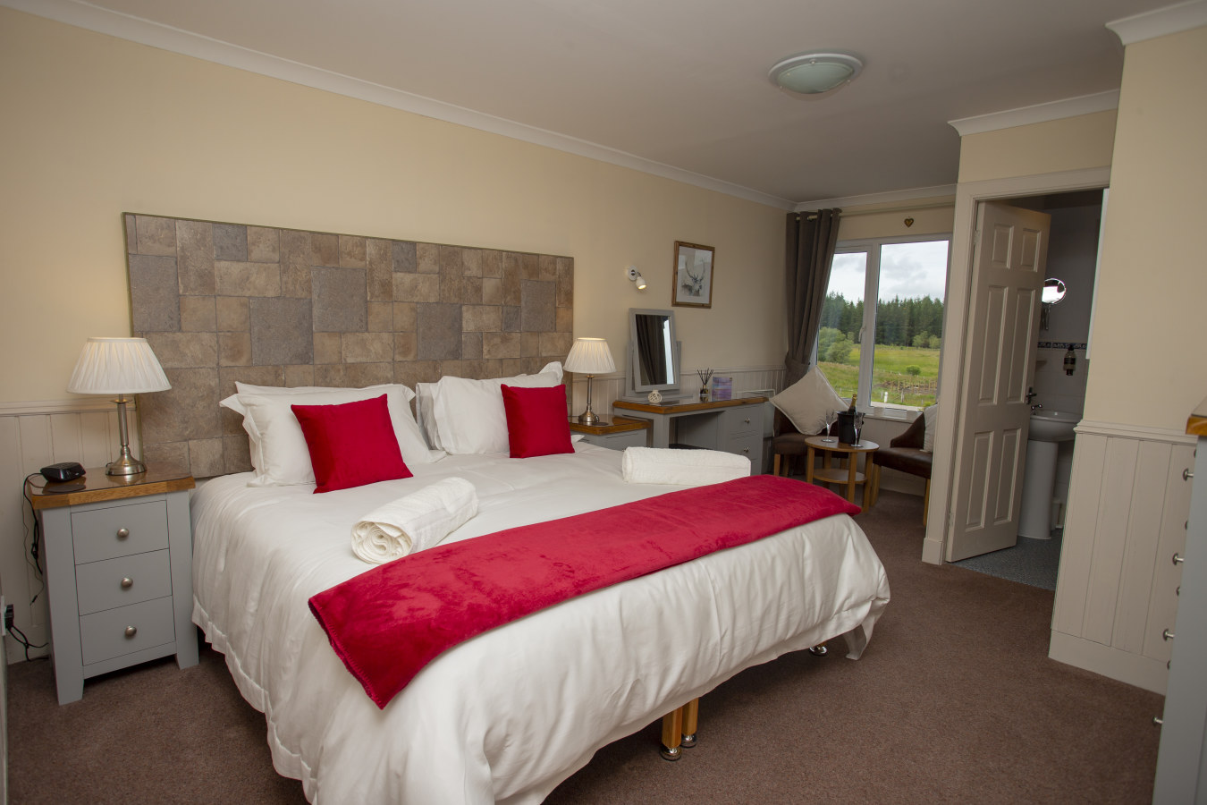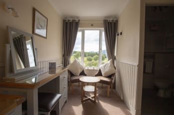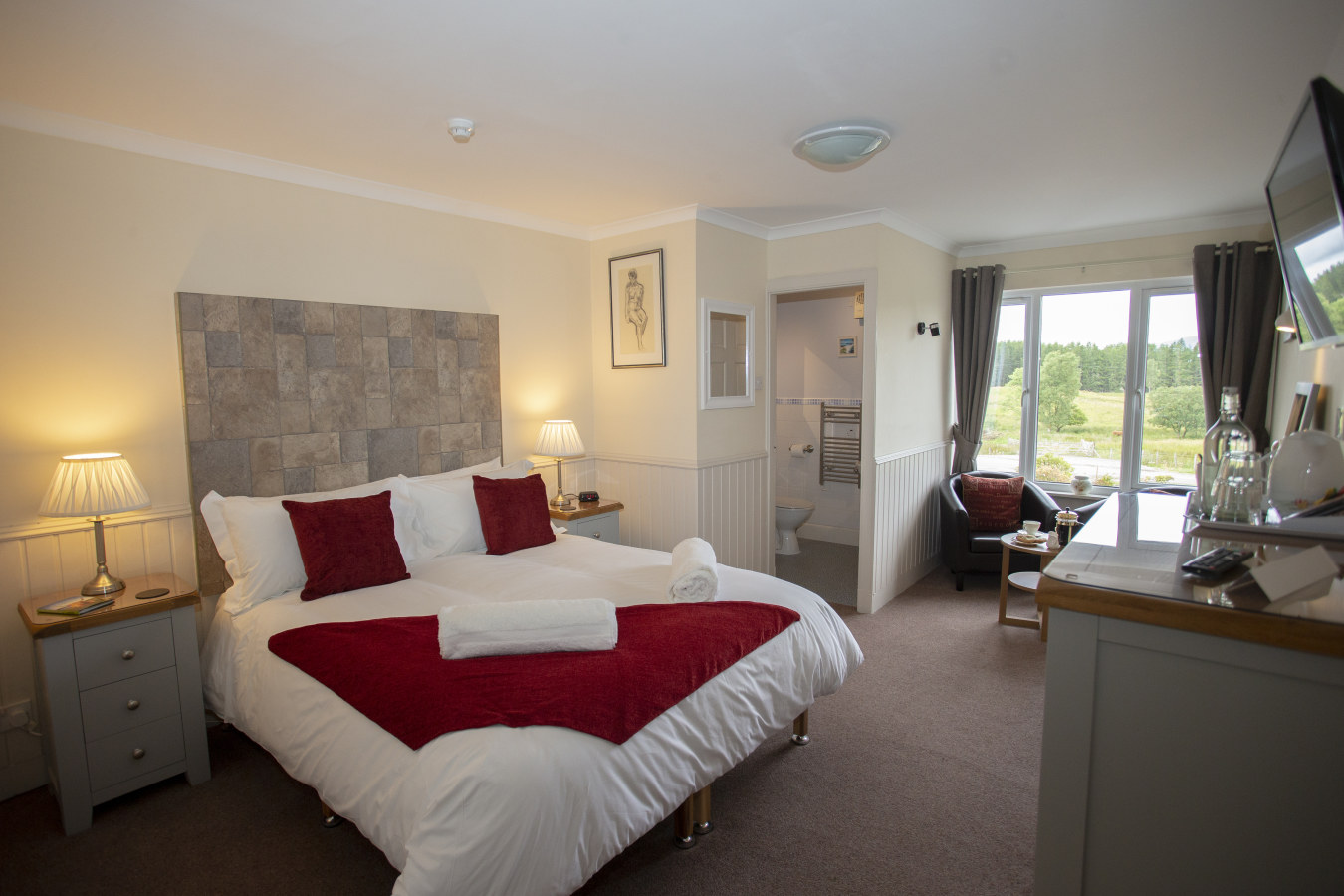 The room has ample storage, a 32" flat screen TV and an en-suite shower room with premium locally made toiletries. Complimentary tea, coffee and cookies are available and the room features a comfortable seating area in which to unwind after a day in the Highlands.Room Facilities: