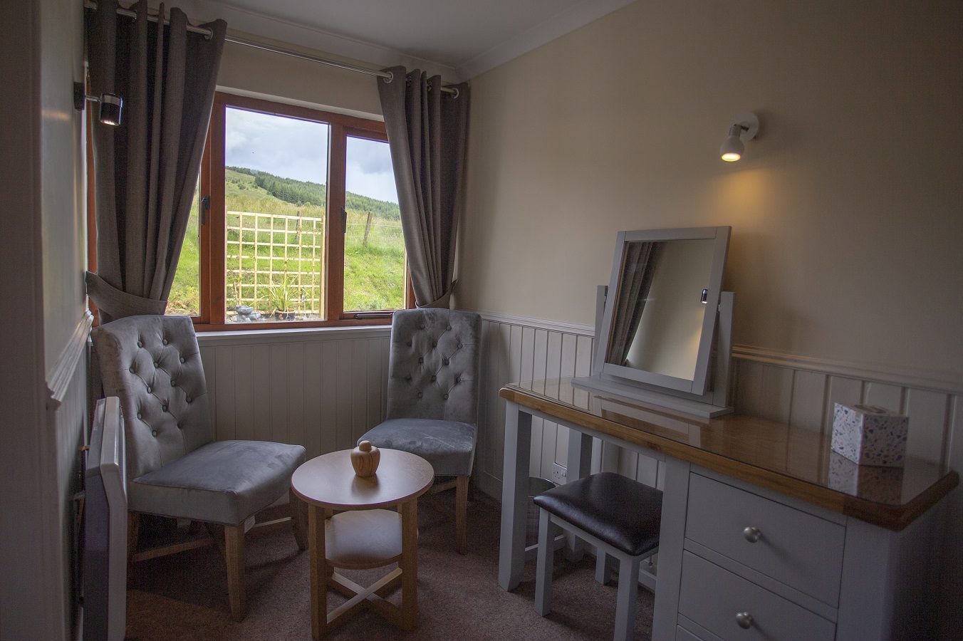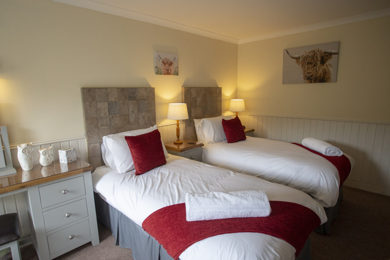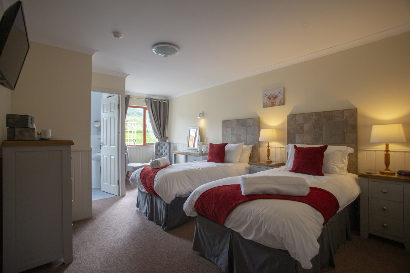 A spacious and comfortable twin room with views over the adjacent croft land.